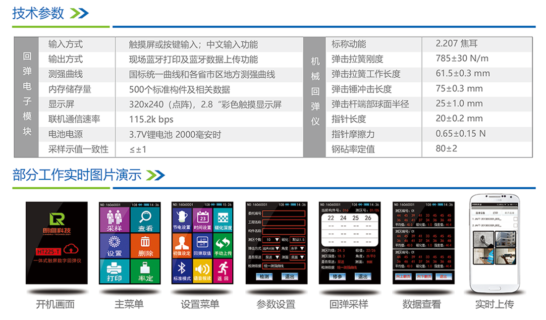 HT225-T型一体式触屏数字回弹仪是由济南朗睿检测技术有限公司精心研制的,具有自主知识产权,荣获多项国家专利。完全符合回弹仪国家检定技术规程《JJG817-2011》的要求,适用于各