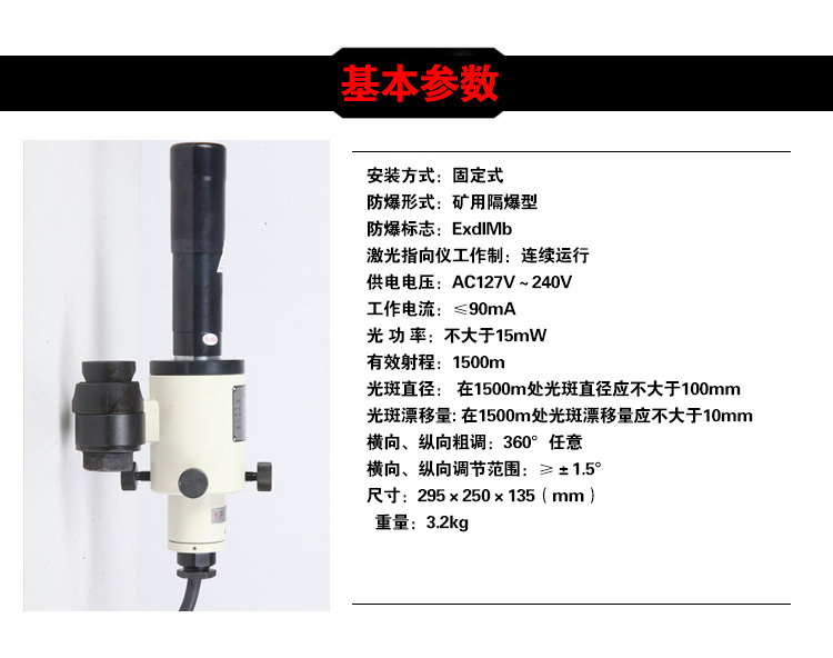 YBJ矿用隔爆型激光指向仪是集电子、光学、精密机械等技术为一体的仪器。具有外形美观、体积小、重量轻、防爆等特点。仪器安装采用固定式,通过悬挂组可快速固定在锚杆上。仪器可在360°范围任意粗调,微调准确;调节方便,制动可靠。产品采用自主研发的光学系统,可采用红、绿两种光源,光斑大小、射程满足矿下施工需求。仪器采用交直流转换电源模块,,交流宽电压AC80V~AC245V供电,具有保护功能。